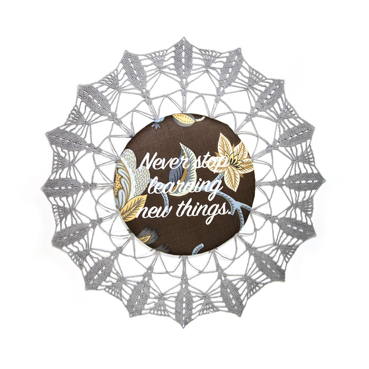 Collected through internet crowd sourcing, each of these pieces shares a simple yet memorable bit of guidance from a Minnesota Grandmother; screen printed onto fabric collected during an annual local clean up week and finished with a crocheted doily border. These quirky wall pieces balance the sentimentality of this precious knowledge with the playfulness often associated with time spent with grandparents.